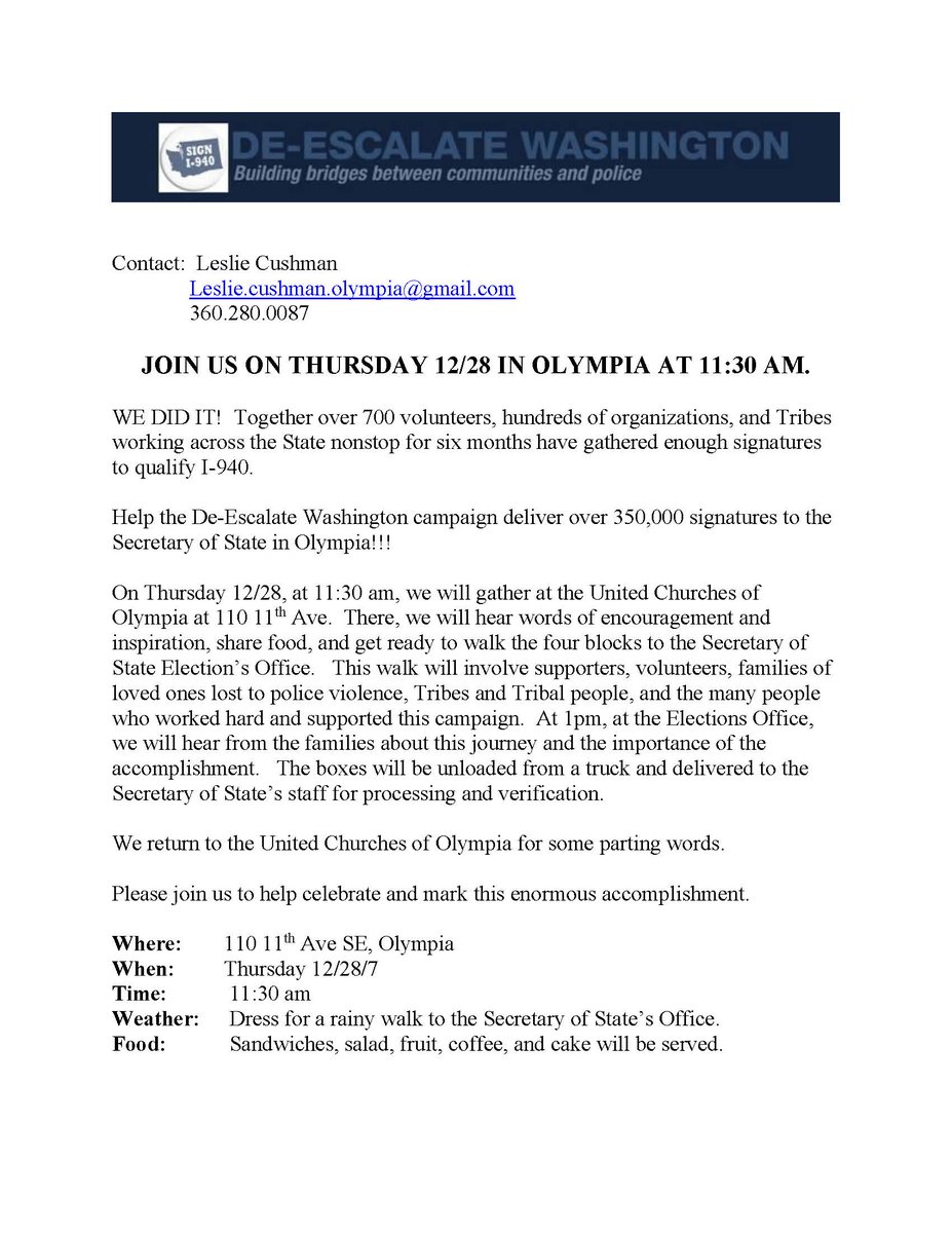 Help the De-Escalate Washington campaign deliver over 350,000 signatures to the Secretary of State in Olympia! Join us on 12/28 at 11:30 and show your support for #Yesi940pic.twitter.com/Rb3qOzwGOX