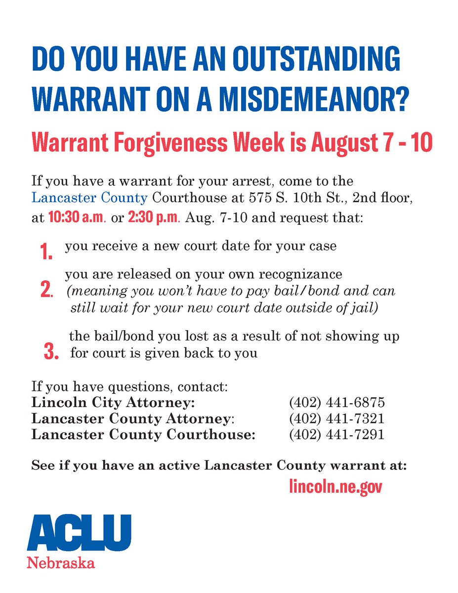 Lancaster County has announced that next week is Warrant Forgiveness Week. To have a misdemeanor warrant forgiven, a person can appear at the Lancaster County Courthouse, 575 S. 10th Street, 2nd floor, at 10:30 a.m. or 2:30 p.m. Aug. 7-10. https://journalstar.com/news/local/911/prosecutors-offer-people-with-lancaster-county-misdemeanor-warrants-chance-to/article_b2cffa50-200d-5f63-9e44-393bd68674c9.html … pic.twitter.com/aDfXh1olU7