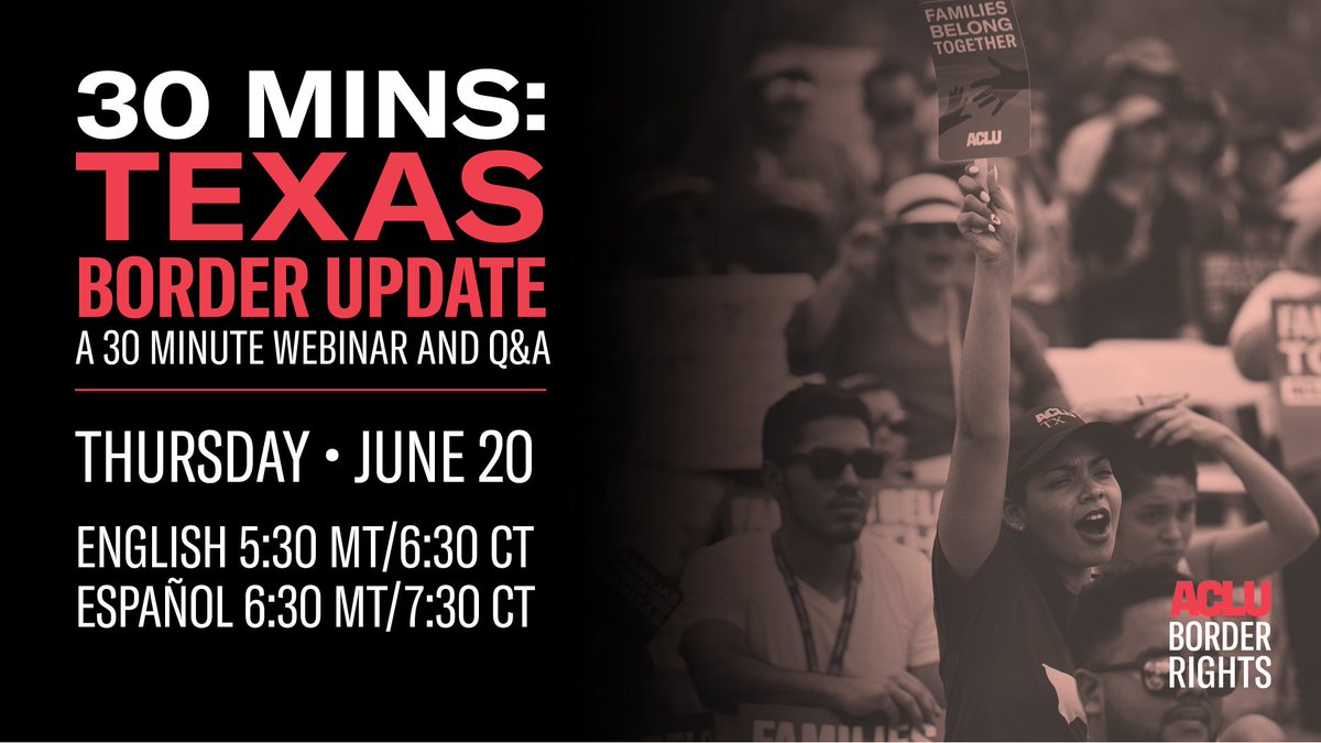 Join the ACLU Border Rights Center tonight for a webinar on the treatment of migrants at the Texas border. There will be two meetings: one in English and one in Spanish. Please complete this form and select the time slot for your preferred language: https://action.aclu.org/webform/tx-border-update?fbclid=IwAR3cRSHckqXrJAmLZLhSWblAYFCiqI9wGxEBjPn7ZaRWoeMS7Lf5zVTiRBI …pic.twitter.com/zLlZucROxr
