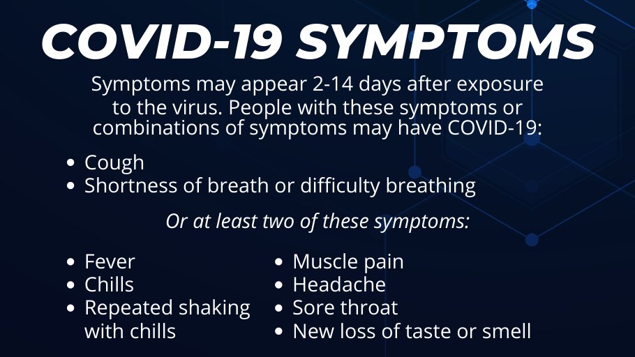 If you have a fever, cough or other symptoms, you might have #COVID19. Most people have mild illness & are able to recover at home. If you think you have been exposed to COVID-19, contact your healthcare provider immediately. Learn more from @CDCgov: https://cdc.gov/coronavirus/2019-ncov/symptoms-testing/symptoms.html … pic.twitter.com/ZUt2Coz4lt