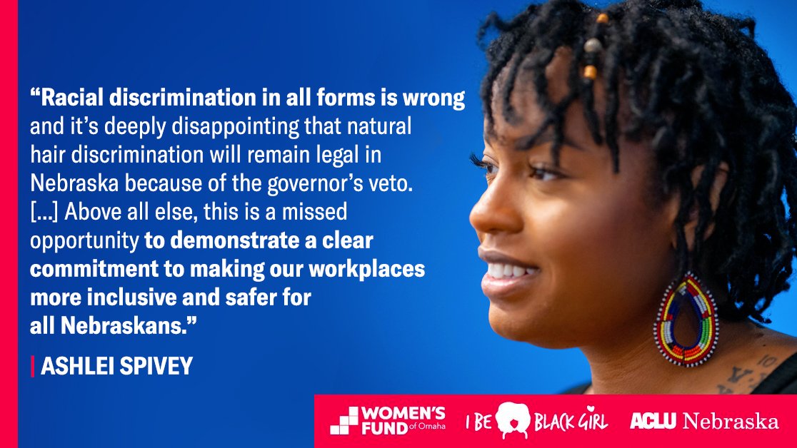 Ashlei Spivey, founder of @ibeblackgirl and ACLU board member, poured a lot into trying to pass the ban on natural hair discrimination. Her statement on the governor's veto is absolutely right. Racial discrimination in all forms is wrong. The need for this protection is urgent.pic.twitter.com/AudHqieThj