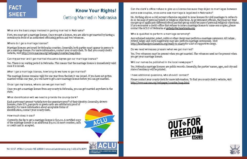 Here are some FAQs about marriage in Nebraska! Get a print-friendly version at http://aclunebraska.org/marriage_faq #Out4Freedompic.twitter.com/kTSiMlwkNC