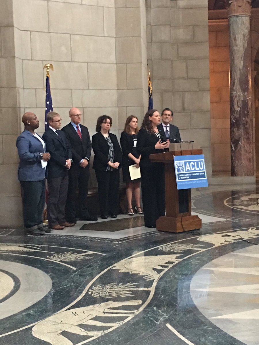 Danielle Conrad, Executive Director of the ACLU of NE, introducing the class action lawsuit against the Nebraska prison system.pic.twitter.com/X6BMng1PMu