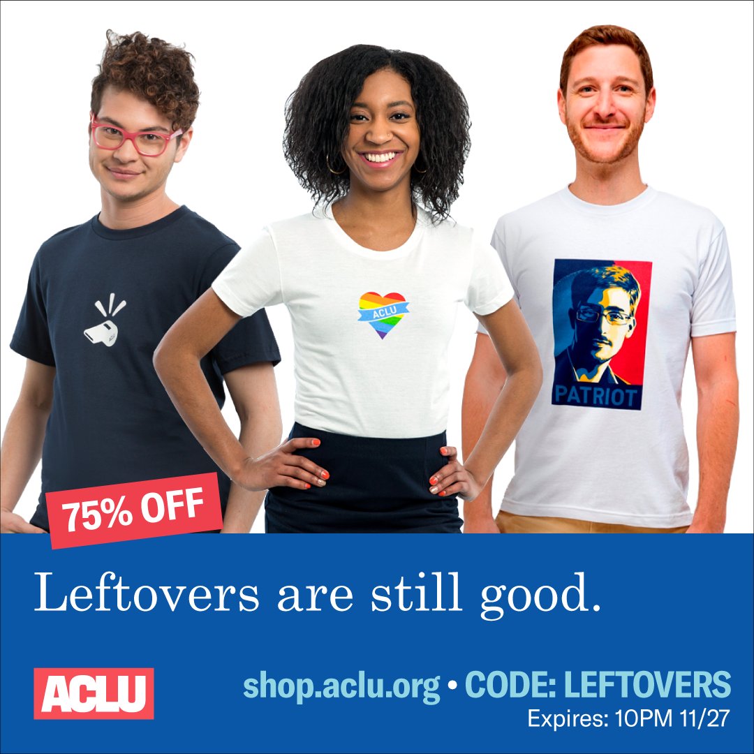 Leftovers are still good. Grab what's left! Selected items marked down 75% all day with promo code LEFTOVERS. https://shop.aclu.org/category/holiday-leftovers?a=leftTW1127 …pic.twitter.com/vbIOBmzbqZ