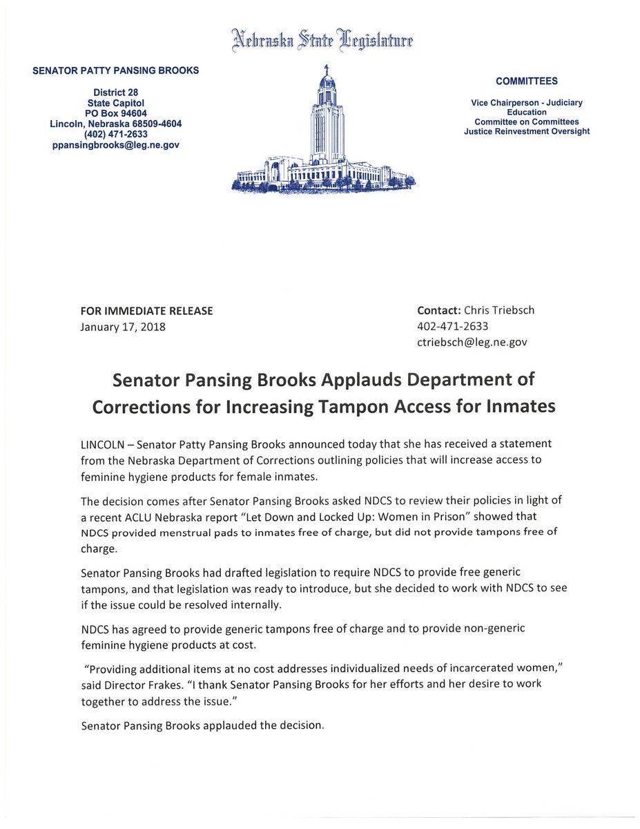 This decision to provide free tampons to women in prison was announced by Sen. Patty Pansing Brooks (@Patty4Nebraska).pic.twitter.com/pzn0jIb0GK