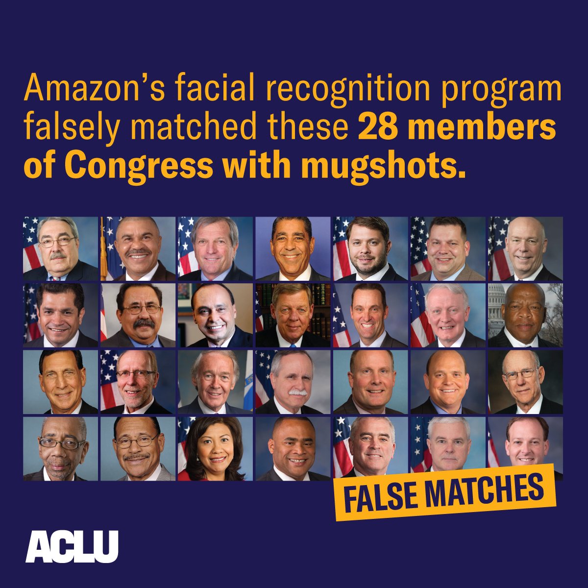 Amazon’s facial surveillance product, Rekognition, falsely matched 28 members of Congress with images in an arrest photo database. Legislators from both parties, from states across the country, were wrongly identified.pic.twitter.com/PvlPbM9sqT