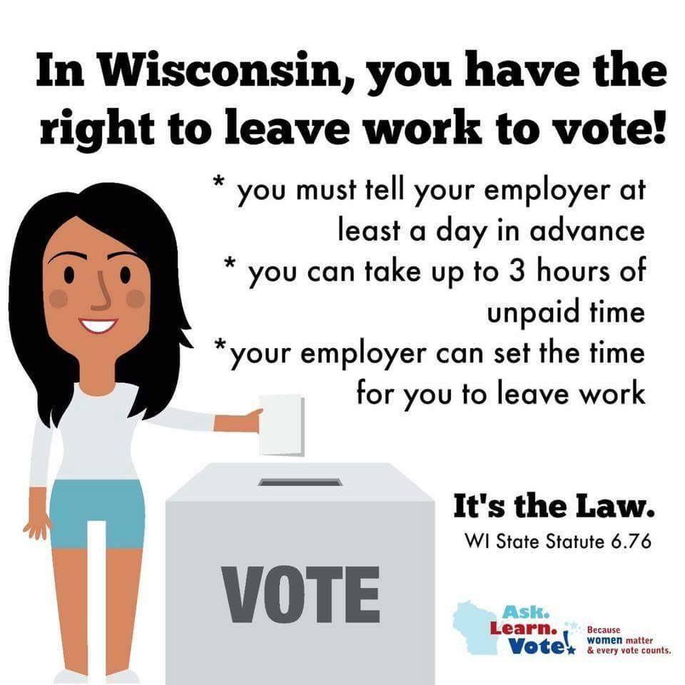 You have the right to leave work to vote, but you have to ask in advance. For more information go to http://www.asklearnvote.org/learn.html .pic.twitter.com/92v0ItThs0