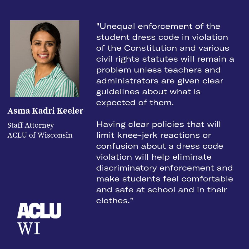 We want to remind school districts that they must not forget the rights of students when putting dress code guidelines in place. Read our recommendations to the Kenosha Unified School District here: http://bit.ly/2wZnLQ6 pic.twitter.com/OOb0SKMVZH