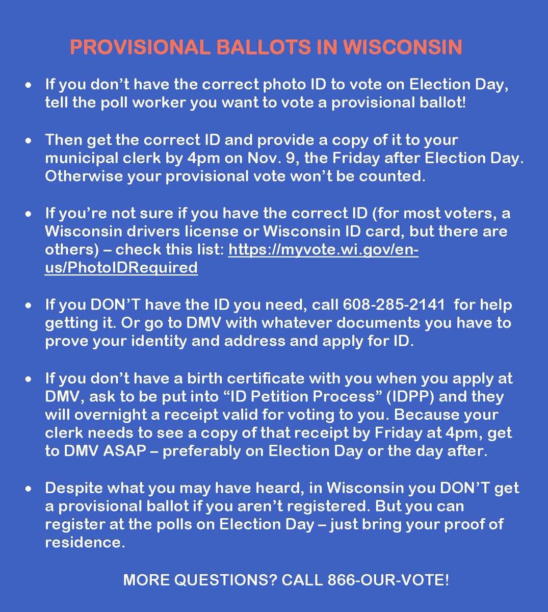 If you don't have the photo ID you need to vote, tell the poll worker you want a provisional ballot! After that, there are people who can help you with the process to get that vote counted. If you are unsure about your ID check here: https://myvote.wi.gov/en-us/PhotoIDRequired …pic.twitter.com/9dH66c38q8
