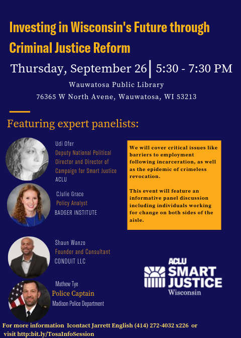We've been touring all over the state discussing, educating, and organizing around criminal justice reform. Our next stop is in Wauwatosa! We'll be at the Wauwatosa Public Library on Thursday from 5:30-7:30.We'd love to see you there!pic.twitter.com/FKP2qii2Fc