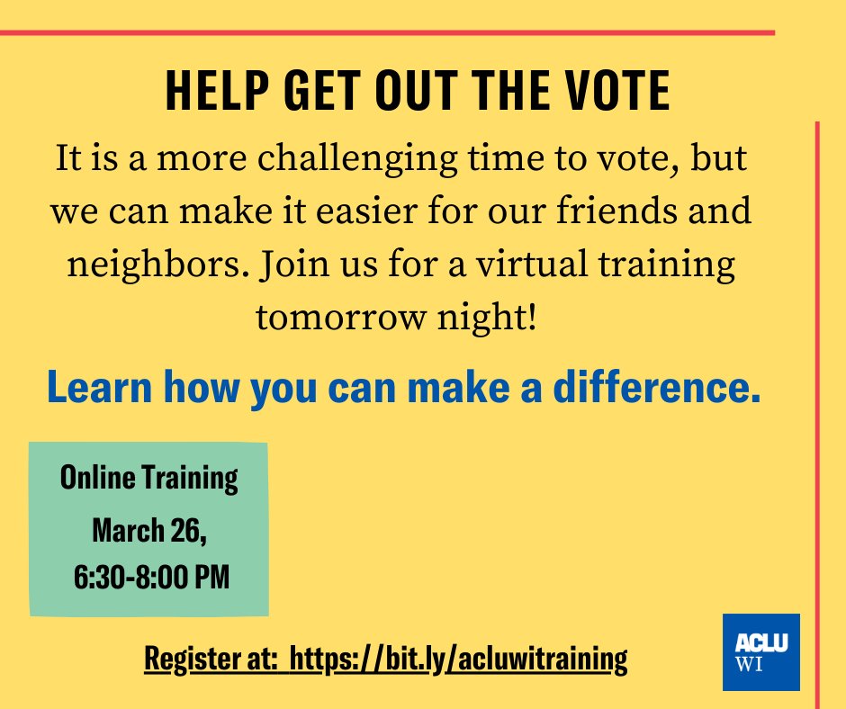 The state Supreme Court has a profound impact on the civil rights and civil liberties of all Wisconsinites, Join us tomorrow night to learn how you can help get out the vote in this critical election. Register for our virtual training here: https://bit.ly/acluwitraining #VoteByMailpic.twitter.com/EPcaqbUbWZ