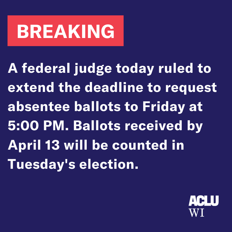 It's unlikely that the My Vote system will be reprogramed to allow people to request an absentee ballot online, so we encourage voters to email or fax their municipal clerk to request an absentee ballot.https://twitter.com/ACLUofWisconsin/status/1245836218815975424 …