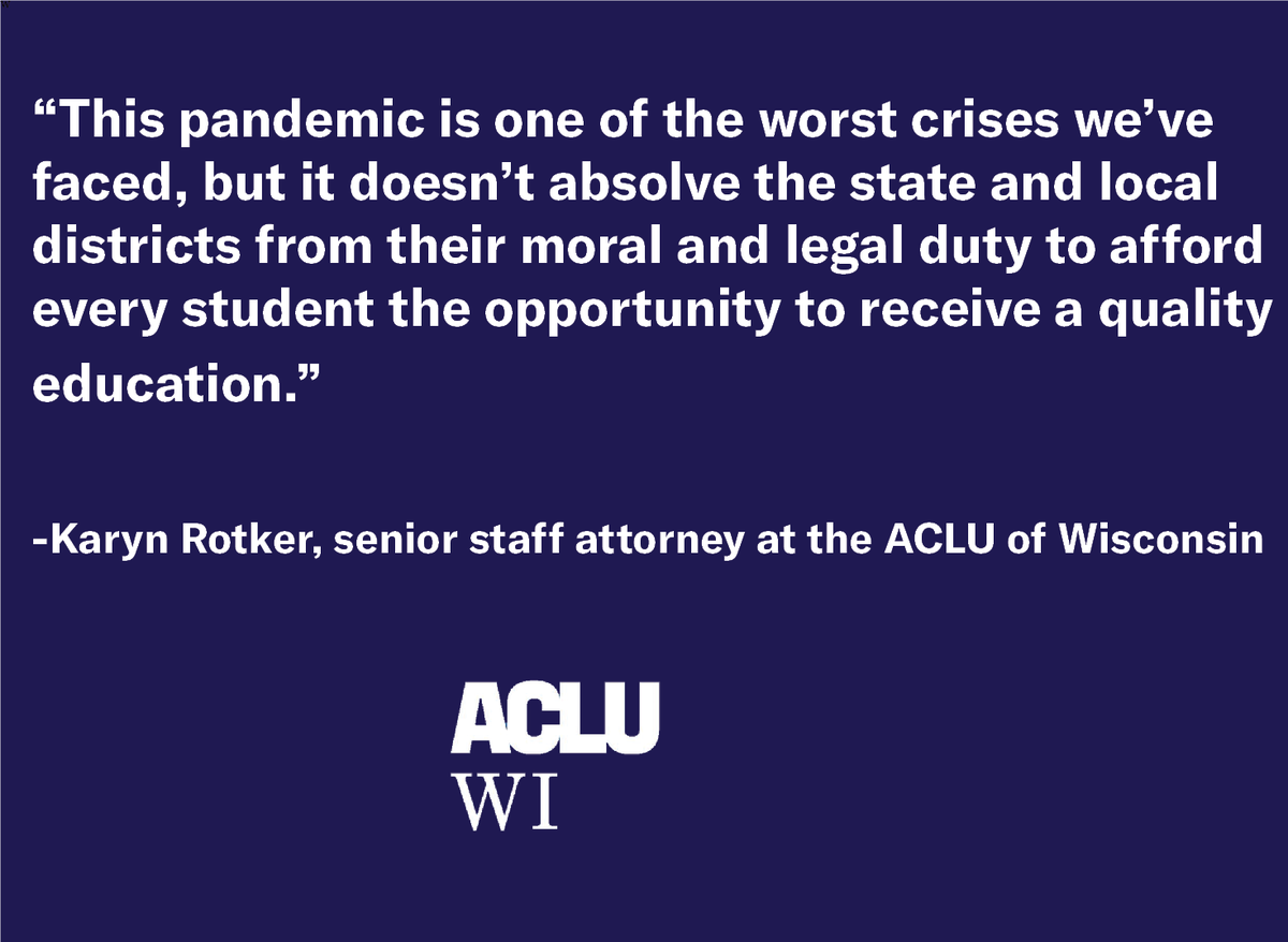 Today, the ACLU of Wisconsin today sent a letter to the Department of Public Instruction asking them to ensure that all students have equal access to quality education amid the pandemic. Read the letter and press release here: http://ow.ly/gk7350AVoou pic.twitter.com/80l449mLMw