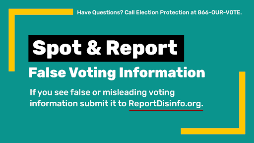 If you see disinformation about voting in an online post or ad, do your part to stop the spread. Don't engage, react or comment — that only means more people will see it! Do take a screenshot to submit it to http://ReportDisinfo.org . #disruptdisinfopic.twitter.com/zYdDUSH14a