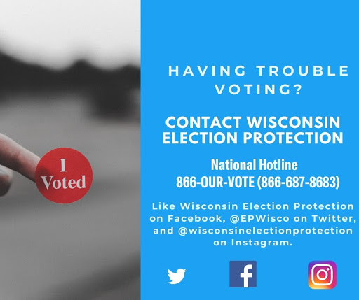 Have questions or concerns about voting today? Wisconsin Election Protection, a group of non-partisan lawyers and voting experts, can help. Feel free to connect with Wisconsin Election Protection, or the National Election Protection Hotline, at 866-OUR-VOTE (866-687-8683).pic.twitter.com/Rol0zDcrC1