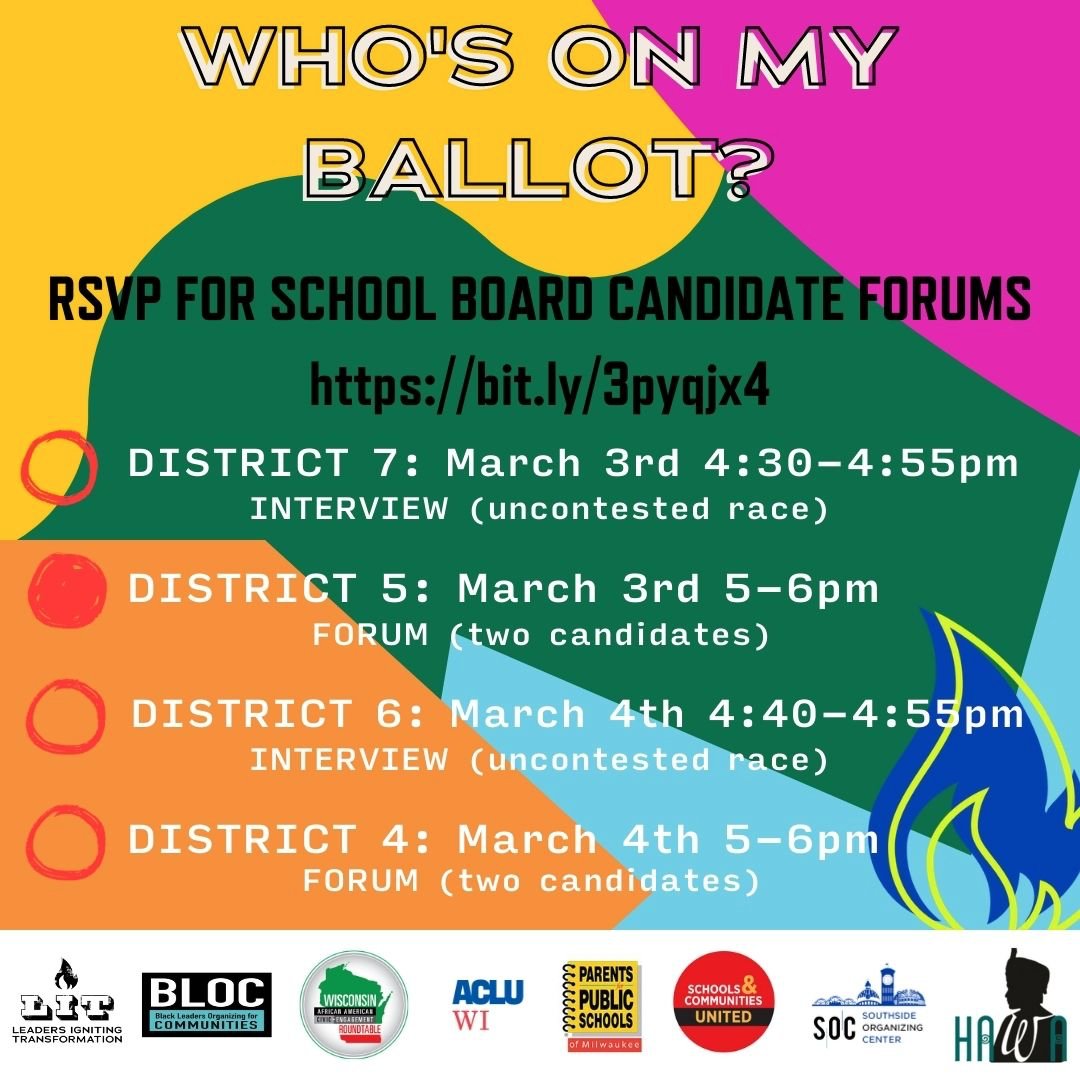 We are 45 days away from the April 6 election! There are 4 Milwaukee Public School Board seats up for election & 6 candidates. Join us March 3 and 4 for a two-day forum. To register, go to http://bit.ly/3pyqjx4 .pic.twitter.com/BXOQMMthml