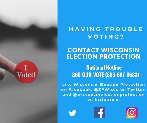 Have questions or concerns about voting today? Wisconsin Election Protection (WEP), a group of non-partisan lawyers and voting experts, can help. Feel free to connect with WEP, or the National Election Protection Hotline, at 866-OUR-VOTE (866-687-8683).pic.twitter.com/GscVdcIVYw