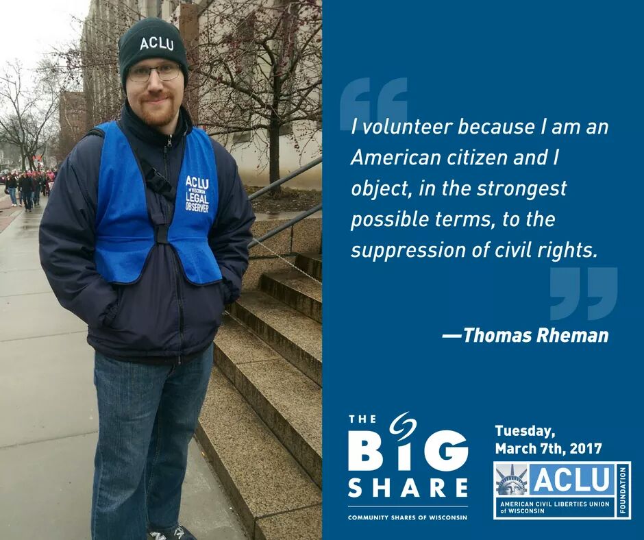We asked our volunteers why they support the ACLU. Help support our efforts by giving during #CSWBigShare on 3/7! https://www.thebigshare.org/organizations/aclu-of-wisconsin-foundation …pic.twitter.com/I8kgqwl4gJ