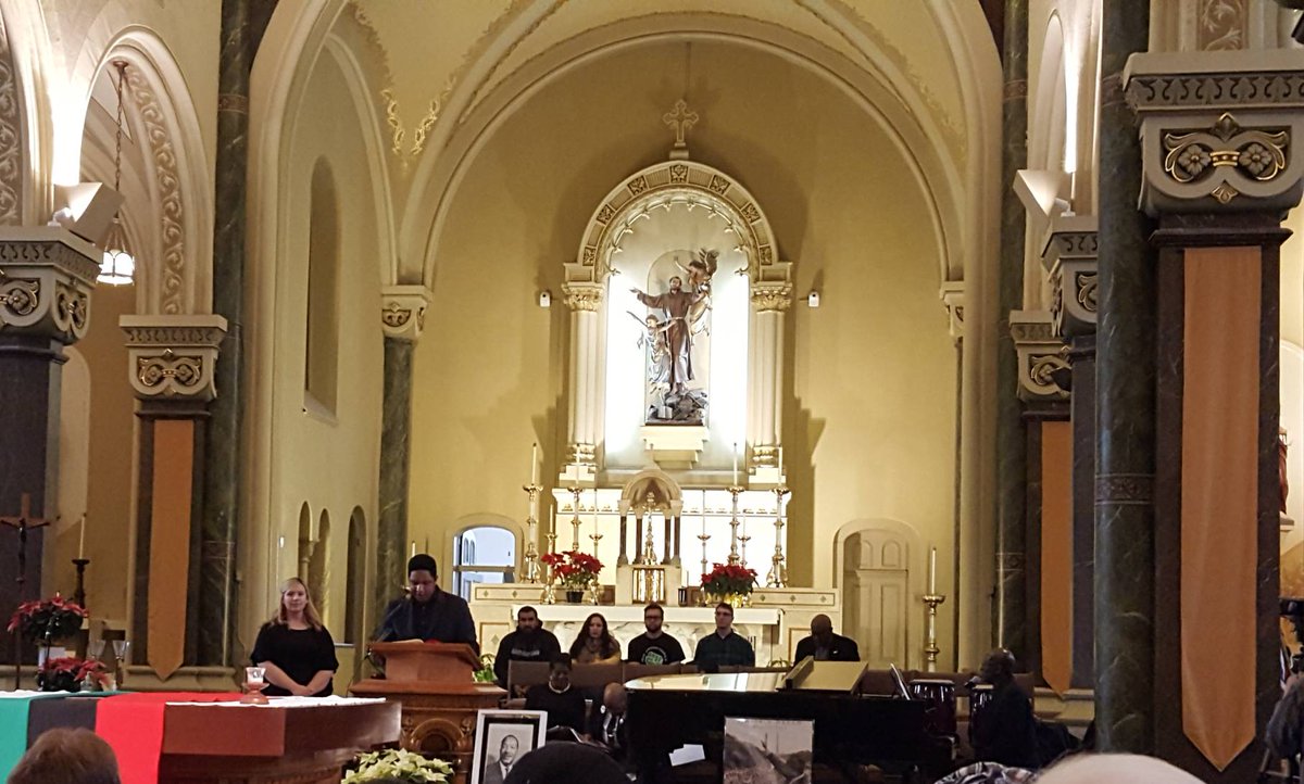 ACLU of Wisconsin organizer Jarrett English speaks to the crowd at the 17th Annual Rev. Dr. Martin Luther King Jr. Celebration at St. Francis Church in Milwaukee. Recognizing heroes of the #MarchOnMilwaukee today as well.pic.twitter.com/e6wxDCPQmA