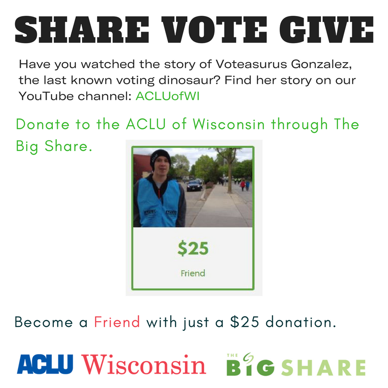 We want to get the word out about Voter ID and Registering to Vote in Wisconsin. Help us to continue to spread the word. Consider donating. Watch the video of how Voteasaurus Gonzalez was able to get her Wisconsin driver's license. http://bit.ly/2H5k4Lo pic.twitter.com/fEXCAFVult