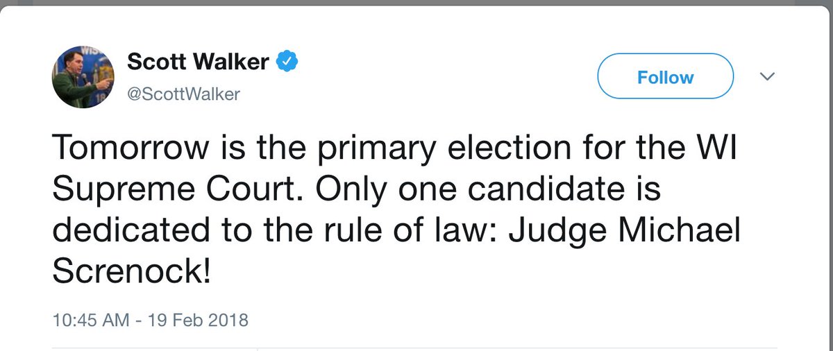 On the day of the Parkland shooting, the NRA endorsed Screnock for Supreme Court Justice in Wisconsin. The NRA is funding his campaign. Scott Walker tried to block special elections, but he's stumping for Screnock. Say NO to NRA bought judges. VOTE for Rebecca Dallet on Tues 4/3!pic.twitter.com/8mW5x1TyhU