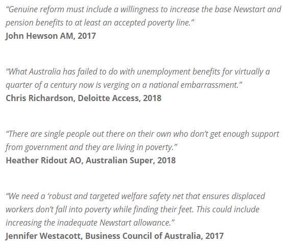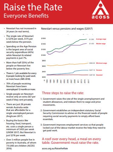 Raising the rate will lift thousands of people out of poverty; improve people’s prospects of finding decent paid work; reduce the huge gap between Newstart + allowance payments and pensions; improve social and economic participation; & strengthen local communities.