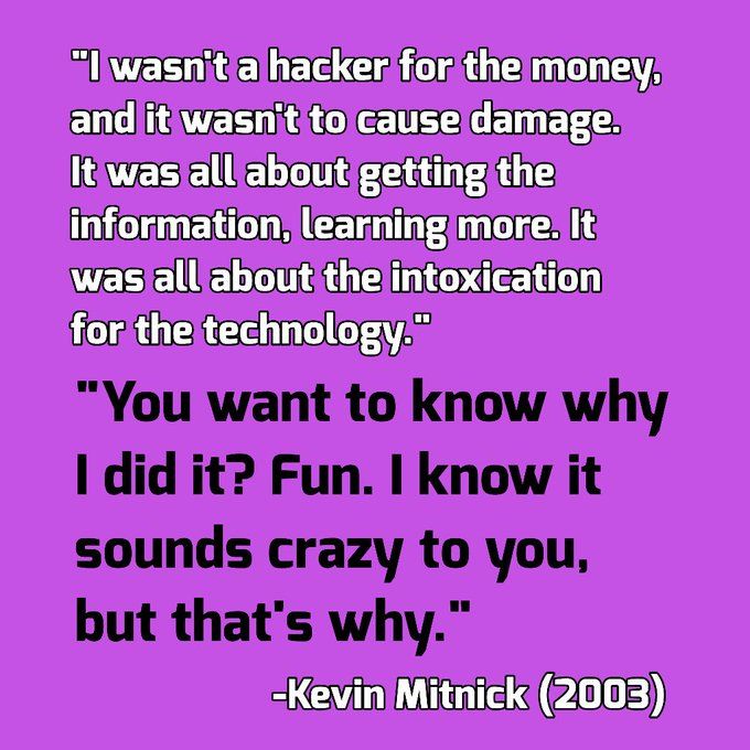 2003: As Kevin Mitnick's parole was ending and he was about to return to the Internet, "The Return of the Super-hacker" was published. It contains numerous quotes from an interview of Mitnick, including these two - which sum up 80s and early 90s hacking. https://bit.ly/2Rwt8m9 pic.twitter.com/u4d7cYcnBd