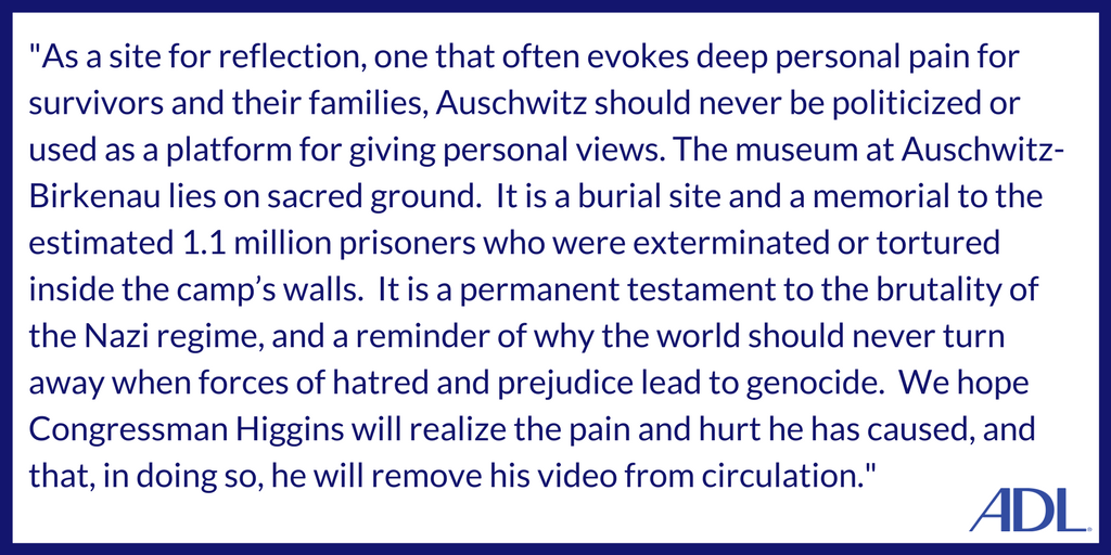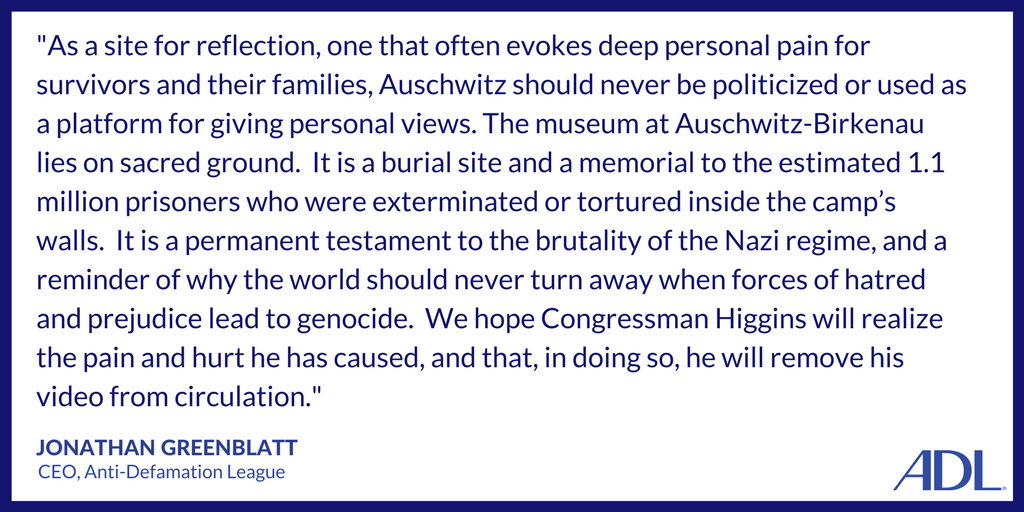 Statement from Anti-Defamation League CEO Jonathan Greenblatt about Higgins' Auschwitz video - urges removal from circulationpic.twitter.com/L2M5jPzlsv