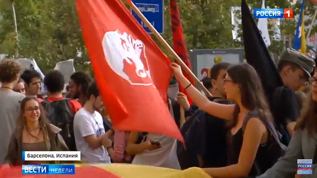 Russian reporter time-travels from the past to #Catalonia in denim suit, finds activist w nat'l anthem of the USSR as ringtone, Soviet flag. pic.twitter.com/eaouVHyG3d