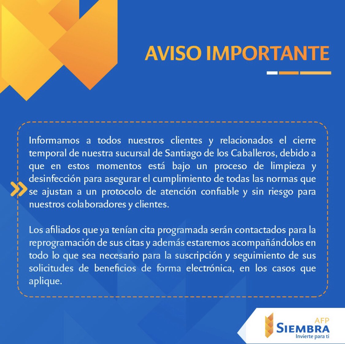 A los afiliados que ya tenían cita programada les estaremos contactando, también pueden escribirnos al correo electrónico beneficios@afpsiembra.com o llamarnos a los teléfonos 809-567-2371 y 1-809-200-2371. Informaremos oportunamente cuando dicha sucursal esté abierta nuevamente.pic.twitter.com/s8L1Aa0KVx