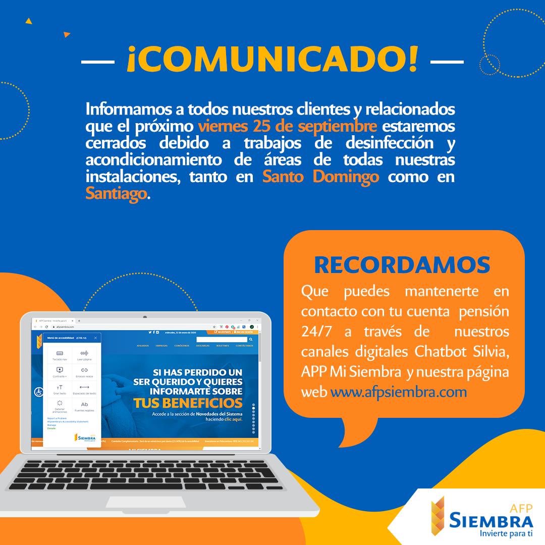 Continuando con el cumplimiento de los protocolos y acondicionamientos de nuestras oficinas y ofrecerles todo el cuidado necesario a nuestros colaboradores y clientes, este próximo viernes 25 de septiembre nuestras oficinas de Santo Domingo y Santiago estarán cerradas.pic.twitter.com/oqcz80CHgF