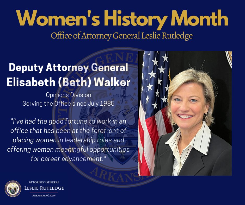 As the 1st female elected AG of Arkansas, I will be celebrating Women’s History Month by showcasing some of the top attorneys in the office who proudly serve the state. Join me in honoring Opinions Deputy AG Beth Walker, who has honorably served our State for 36 years!pic.twitter.com/sJZxwhvhQ9
