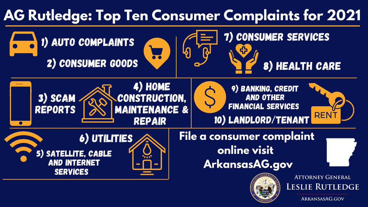 In 2021, the Attorney General’s Office received 110,000 calls and emails about consumer complaints. Here are the Top 10 consumer complaints of 2021: https://arkansasag.gov/news_releases/ag-rutledge-top-ten-consumer-complaints-for-2021/ …pic.twitter.com/ne6P6lQI6c