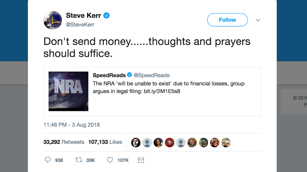 Warriors coach mocks NRA financial trouble: "Don’t send money, thoughts and prayers should suffice" http://hill.cm/SaXcuhK pic.twitter.com/ZNpDVtBhpS