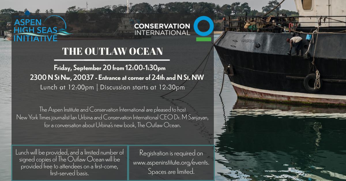 Come join us at the @AspenInstitute in Wash, DC on Sep. 20 for a chat with @ConservationOrg's @msanjayan and @ian_urbina, NYT *Best-Selling* author of THE OUTLAW OCEAN. Lunch and a limited number of signed copies provided free to our guests. RSVP here: https://www.aspeninstitute.org/events/the-outlaw-ocean-a-conversation-with-high-seas-journalist-ian-urbina/ … pic.twitter.com/7MD7KrHcqQ