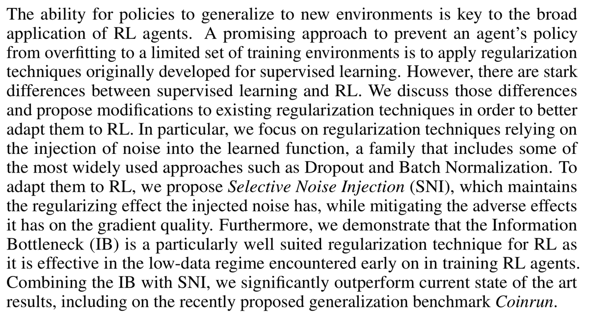 #NeurIPS2019 paper "Generalization in Reinforcement Learning with Selective Noise Injection and Information Bottleneck" is on arXiv: https://arxiv.org/abs/1910.12911 . w/@MLciosek,@liyzhen2, Sebastian Tschiatschek, Cheng Zhang,@smdvln and@katjahofmann. Thread:pic.twitter.com/QkclIX0oRF