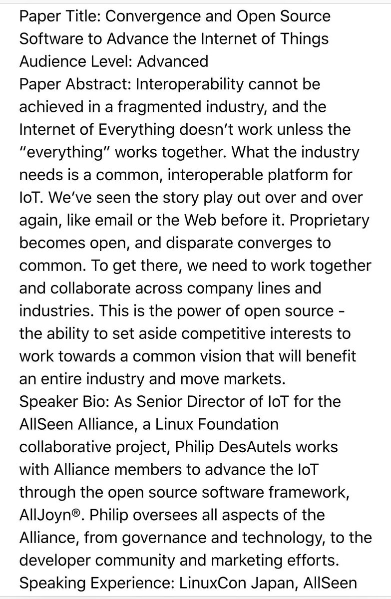 Session proposal by Philip DesAutels —@LinuxFoundation #IoT #M2M #BigData #Linux #Microservices #InternetOfThingspic.twitter.com/8mUQquE2Fe