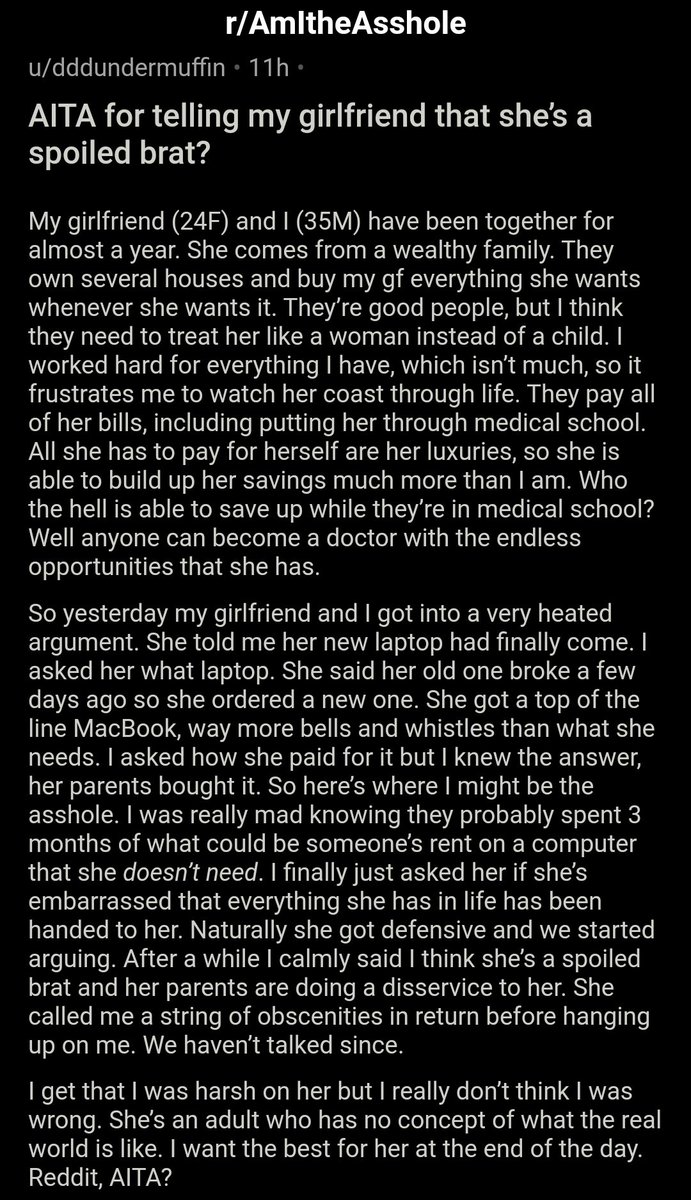 AITA for telling my girlfriend that she’s a spoiled brat? https://bit.ly/3eMV7VS pic.twitter.com/pGorSFWIQQ