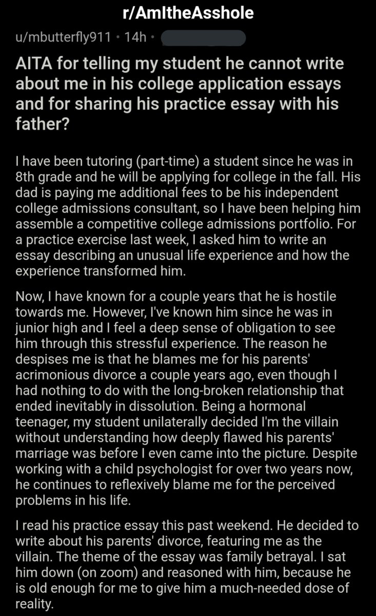 AITA for telling my student he cannot write about me in his college application essays and for sharing his practice essay with his father? https://bit.ly/3cvix0w pic.twitter.com/NGiExnsJff