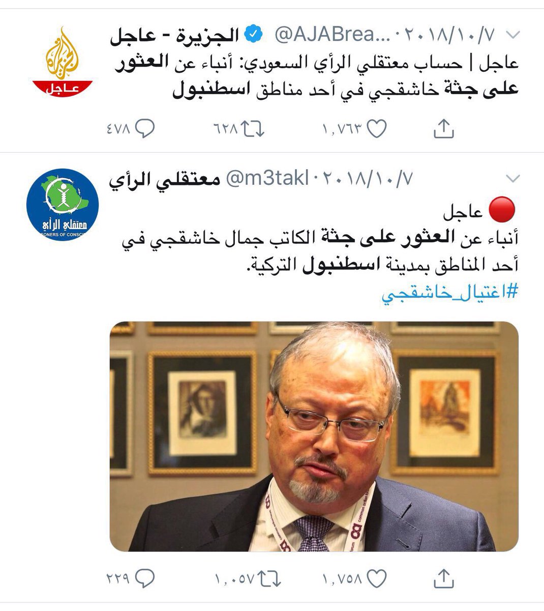 قبل إعلانهم عن العثور على الجثة كأنو يقولون مخطوف ووصل الى جدة وبعد إعلانهم عن العثور على الجثة أصبحوا يؤكدون مقتل جمال خاشقجي داخل القنصلية وكل يوم يخترعون قصة وحكاية لتشوية #السعودية امام الرأي العام العالمي ابحثوا عنه لدى استخبارات تركياpic.twitter.com/BEIi23sNqz