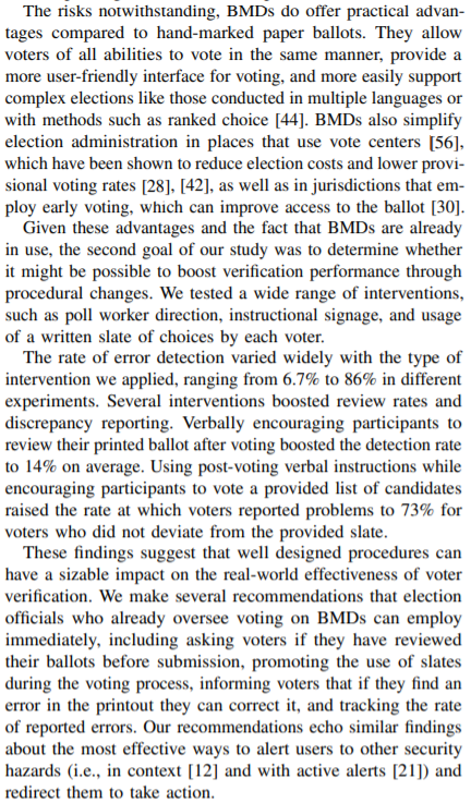 Not reported in either story about this study was this key passage, indicating that BMDs have several other advantages to hand-marked ballots, and that simple instructions to voters boosted the verification and detection rate to as high as 86%! Everyone should read this section! https://twitter.com/danwallach/status/1214921501742391297 … pic.twitter.com/sLzJmDGNAy