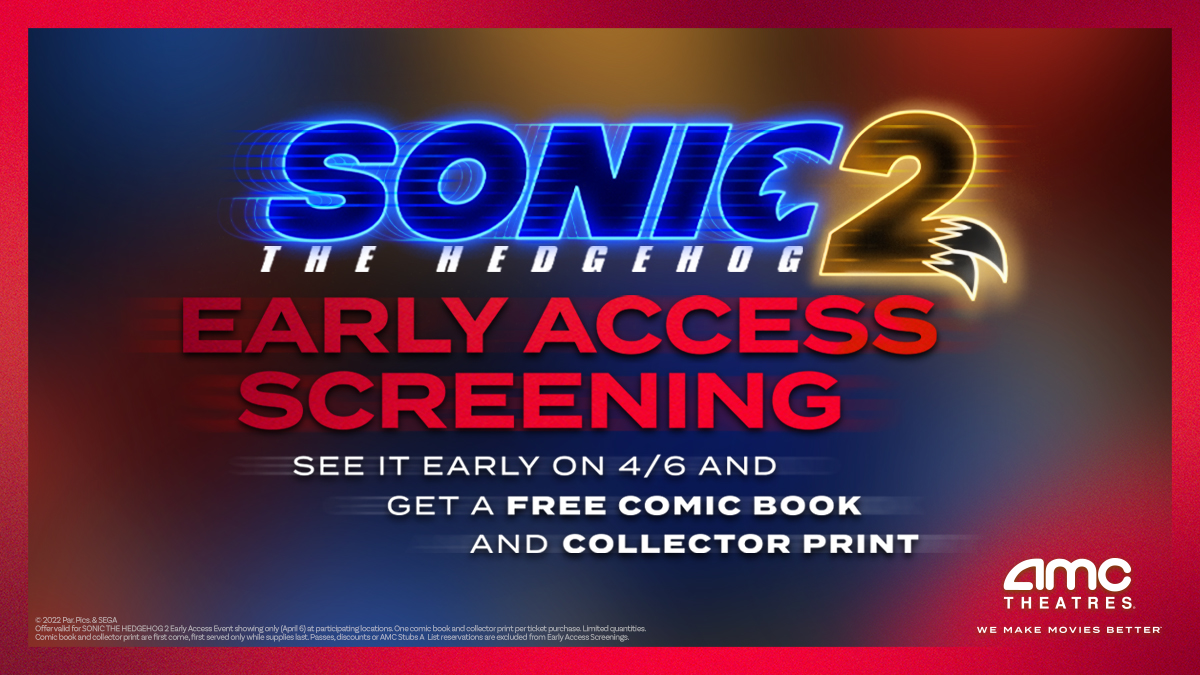 @SonicMovie Early Access Screening on 4/6. You'll see the action-packed sequel two days early, and receive a FREE limited edition comic book & collector print! https://amc.film/35Q3hhv pic.twitter.com/XJfYgokFOB