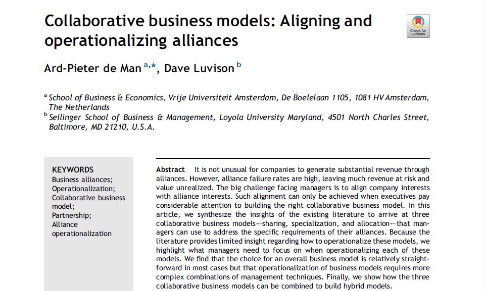 Do you need to build a collaborative business model? This article (https://lnkd.in/da2HDi4 ) describes the three most common business models for partnerships and alliances. It clarifies when to use which model and how to manage collaborative business models over time.pic.twitter.com/sSfDvr7b5F