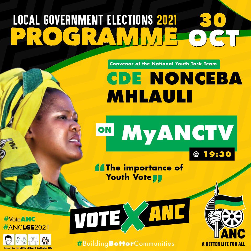 @NoncebaMhlauli live on@MYANC TV from 19:30 with Penny Lebyane speaking on the importance of the Youth Vote in these Local Government Elections.#VoteANC#WeTheYouth#ANCLGE2021#BuildingBetterCommunitiespic.twitter.com/301K4y4l6p