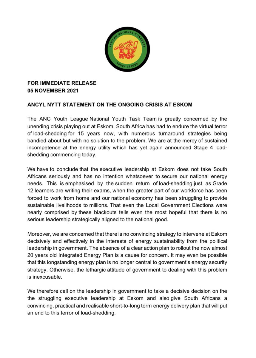 ANCYL NYTT STATEMENT ON THE ONGOING CRISIS AT ESKOM