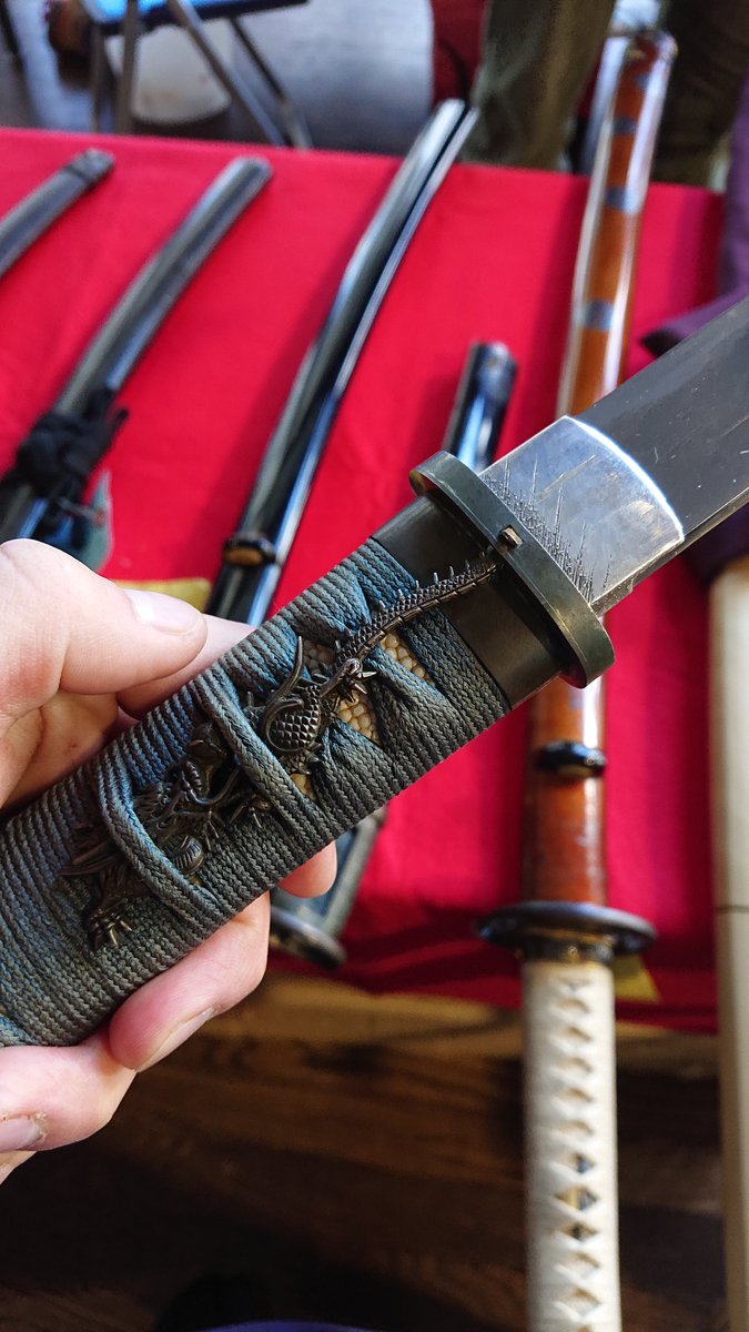 「刀剣はたや」さんにあった非常に珍しい短刀拵え 目貫の竜の尾が駐爪の役割をして、不意に抜けないようになっております。 軍刀以外に駐爪が着いてるの初めて見たし、それが目貫であるというのがオシャレ過ぎる… おそらく幕末の作とのことです。pic.twitter.com/EQgHJhDfnU