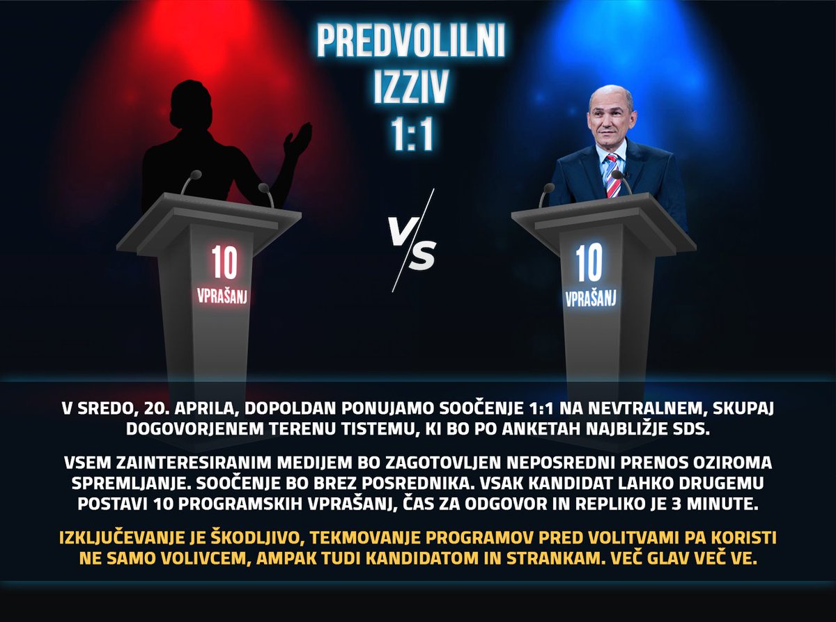 V sredo, 20. aprila, ponujamo soočenje 1:1 na nevtralnem, skupaj dogovorjenem terenu tistemu, ki bo po anketah najbližje @strankaSDS.pic.twitter.com/vtKgTSEcqq