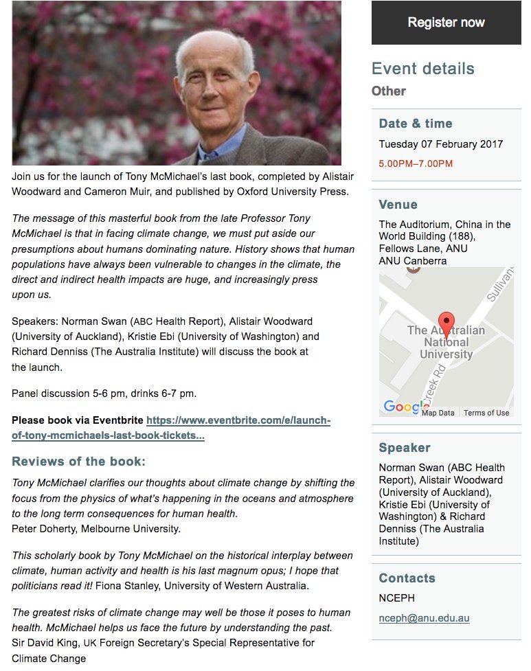 Coming up in 2017:Book launch of Tony McMichael's last book, Climate Change & the Health of the Nations:http://bit.ly/2hn3NIC