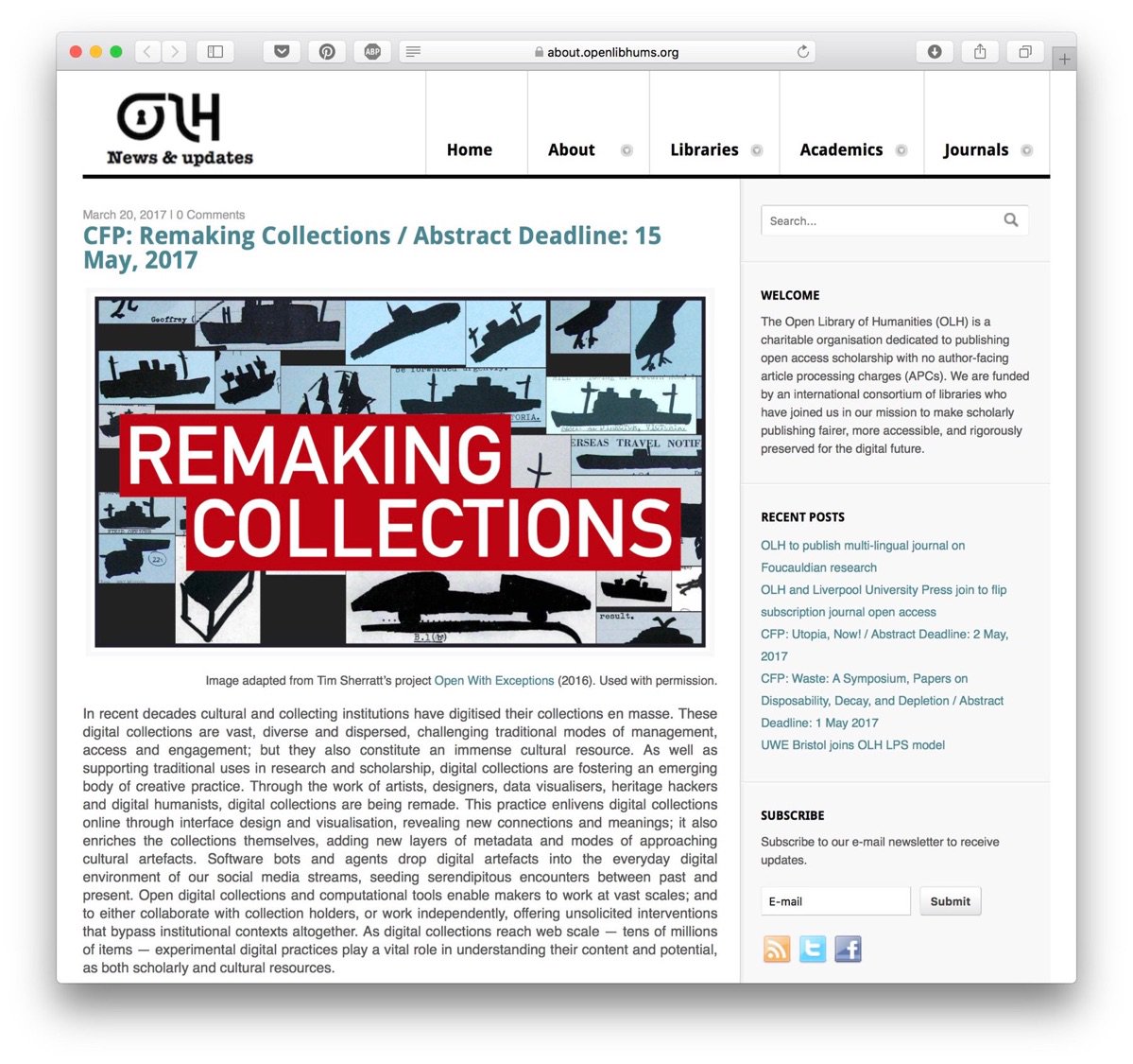 @openlibhums issue are emerging, and they are very fine. Abstracts due soon: https://about.openlibhums.org/2017/03/20/cfp-remaking-collections-abstract-deadline-15-may-2017/ …pic.twitter.com/6P5t1dyvIn