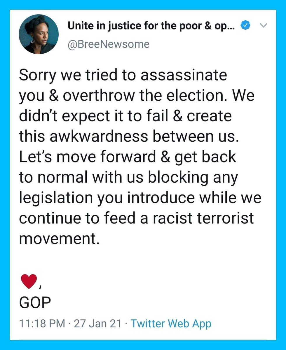 I am happy to work with Republicans on this issue where there’s common ground, but you almost had me murdered 3 weeks ago so you can sit this one out. Happy to work w/ almost any other GOP that aren’t trying to get me killed. In the meantime if you want to help, you can resign.https://twitter.com/tedcruz/status/1354833603943931905 …